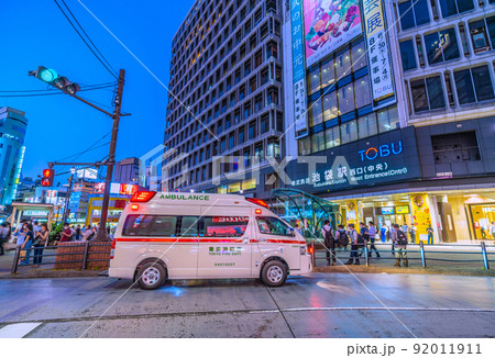 日本の東京都市景観 猛暑日が7日連続の東京都心…池袋駅前に出動した救急車=7月1日