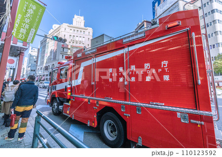 日本の東京都市景観 年の瀬・賑わう浅草駅前に出動した東京消防庁特別救助隊…=令和5年12月29日