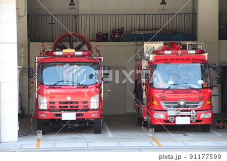 消防署 消防車 入り口 待機 出動前 火災現場 災害 火事 隊員 消防車 火災現場 火災 消防士