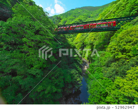 新緑の出山鉄橋を渡る箱根登山鉄道の電車