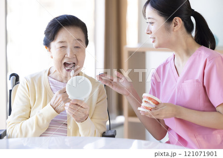 シニア女性の歯磨き指導をする若い歯科衛生士