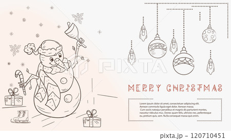 Christmas contour illustration in the style of childrens doodles with the text Lorem Ipsum The Snowman rings the Christmas bell