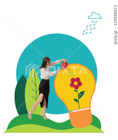 Woman watering flower inside light bulb, symbolizing innovation and growth of sustainable ideas for greener future. Conceptual art collage.