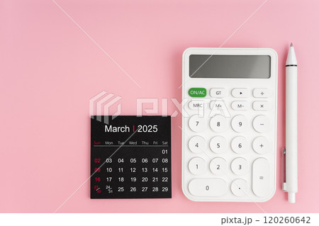 Top view of March 2025 calendar and white calculator with pen on pink background.