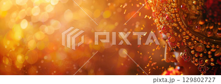 An Indian woman in a national costume, A vibrant scene celebrating Dussehra with golden lights and decorative elements. horizontal banner, copy space, free space for text