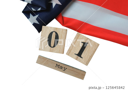Wooden blocks show May 1 with an American flag for Labor Day, isolated on white