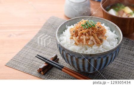 湯気立つ白ごはんにちりめん山椒 和朝食の献立・ご飯のお供・お弁当素材にも最適な一品