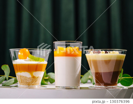 Delicious desserts displayed in elegant glasses at a cozy cafe