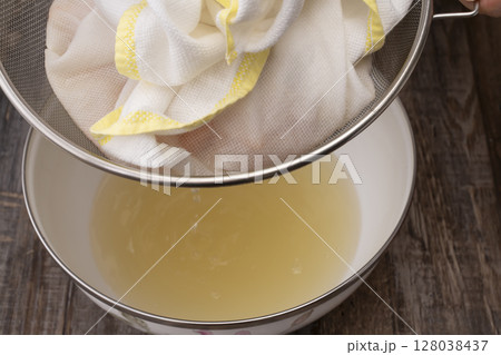 野菜コンソメスープを作る工程 煮込んだ野菜を漉してスープをとる