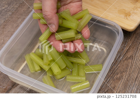 野菜コンソメスープを作る工程 野菜を刻み煮込む セロリの筋,取る