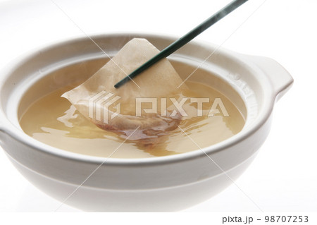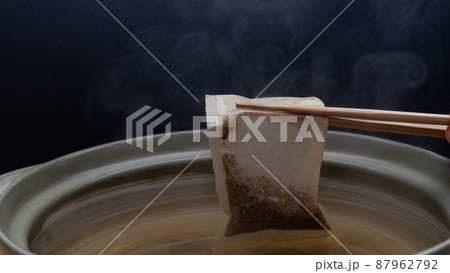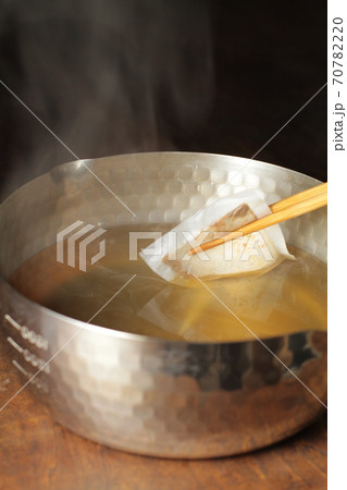 和風出汁、湯気、粉末出汁パックで出汁を取る、調理シーン