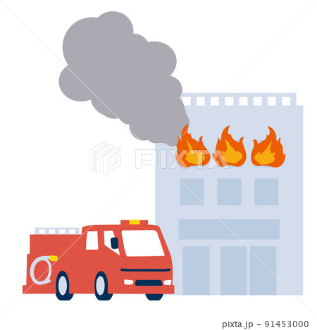 火災が起きたビルと消防車のイラスト