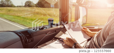 City skyline cargo truck in front of blue circle and stopwatch. Ideal for logistics, transportation, delivery services, punctuality, urban planning, efficiency, business. Line metaphor