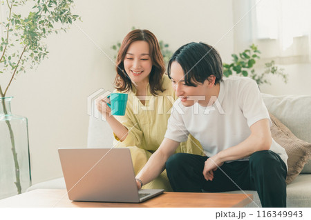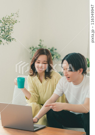 カップル 夫婦 リビング ノートパソコン