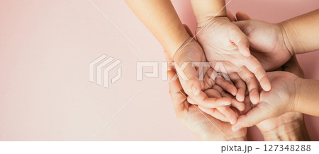 Parents and kid holding empty hands together isolated on color background. Family day celebrating togetherness and support.