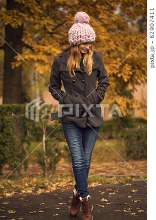 Beautiful young woman wearing merino wool pastel colors hat and scarf enjoying the fresh morning outdoors