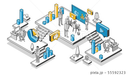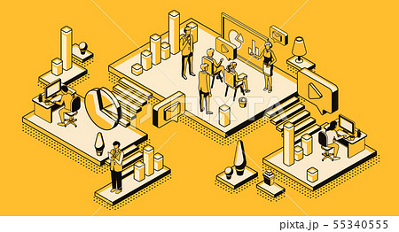 Investment strategy isometric concept. People with analytics data diagrams. Digital business