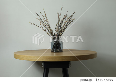 Pussy willow branches arranged in a simple vase standing on a table in a minimal interior.