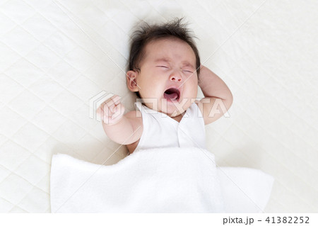 眼に涙を溜め、大きな口を開けて泣く新生児赤ちゃんの顔のアップ。赤ちゃんの要求、不快、訴え、健康、成長