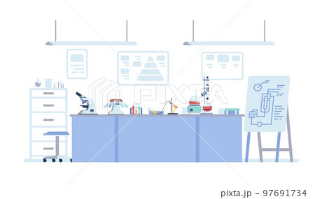Modern chemistry laboratory or chemistry classroom interior. Scientific research. Experiment equipment. Lab desks with beakers and test tubes. Microscope and flask burner. Vector concept