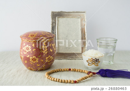 遺影と骨箱と数珠の葬式のイメージイラストです。