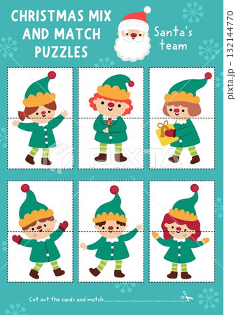 Vector Christmas mix and match puzzle. Matching New Year activity for preschool kids with Santa Claus friends. Winter holiday printable cards or table top game with elves in green clothes