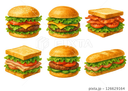 Png assorted burgers and sandwiches set isolated on transparent background. concept of fast food variety, delicious meal options, quick cuisine illustration for design assets