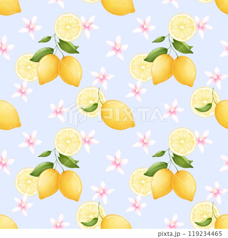 Watercolor hand drawn illustration with lemons. Decorative seamless pattern. Background with fruits, leaves and flowers on a branch. For fabric, packaging paper, scrapbooking.