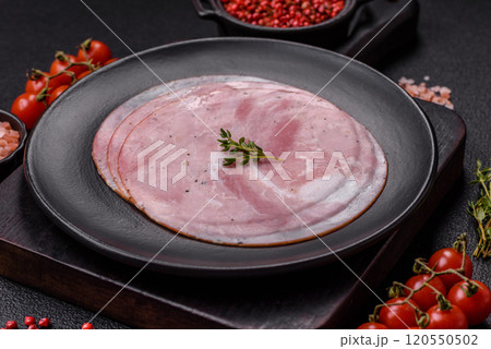 Delicious fresh ham cut into round slices with salt, spices and herbs