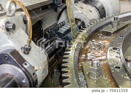 large gear cutting machine at a Metalworking plant. Oil cooling of the cutter