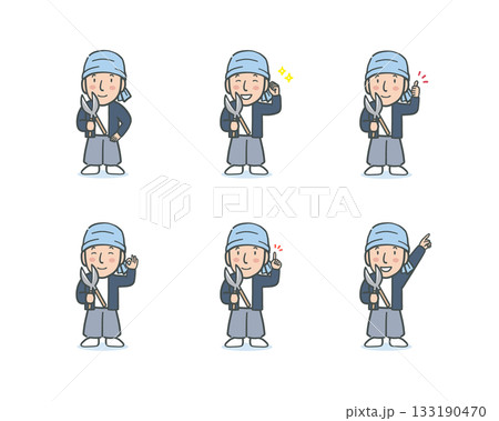 作業服を着てはさみを持った庭師の表情ポーズセット