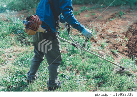 草刈り、除草イメージ 草刈り機を持つ男性 顔なし