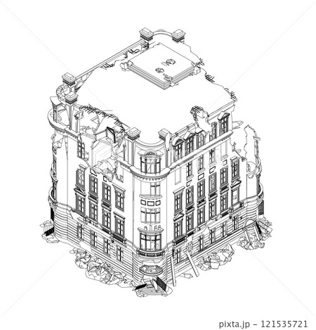 The outline of the destroyed building from black lines isolated on a white background. Front view. 3D. Vector illustration.