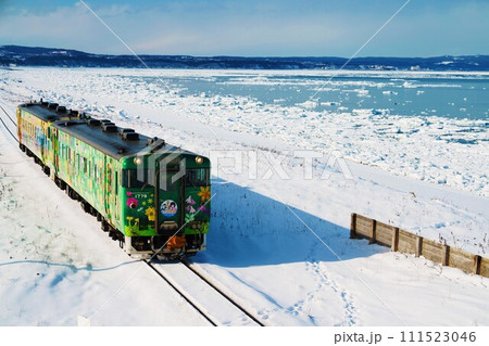 流氷広がるオホーツク海と観光列車{流氷物語号}