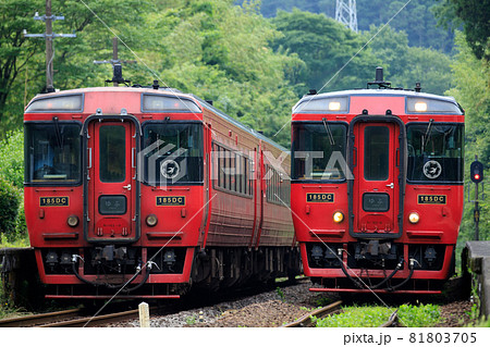 志井駅で行き違いを行うキハ185系とキハ147形(JR九州)