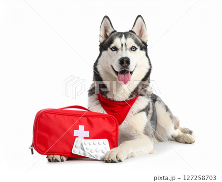 AI generated happy siberian husky dog with emergency AED pads symbolizing pet emergency care and life-saving veterinary treatment concept white background animal health crisis response