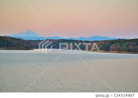 富士山 初冬 冠雪 朝焼け 狭山湖畔からの眺め