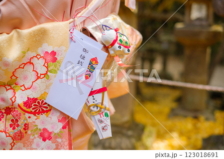 神社にお宮参りをする女性と紐銭 伝統 儀式