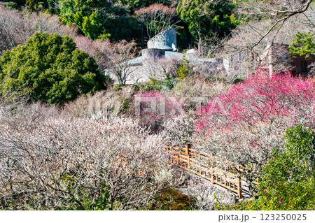 静岡県熱海市 熱海梅園 香浮橋(こうふばし)から頂上韓国庭園方面の梅林 早咲きの梅