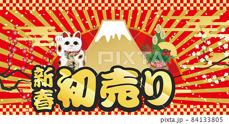 お正月の初日の出と縁起物のベクターイラスト背景(セール、初売り、バナー))