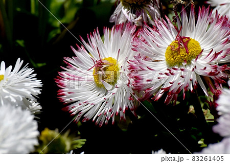 三鷹中原に咲く赤と白のデイジー(ヒナギク)の花