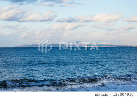 別海北方展望塔から眺める国後島の島影 北方領土 道の駅おだいどう