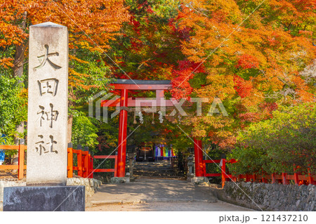 秋の京都 大田神社 紅葉に包まれた鳥居