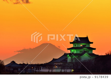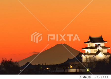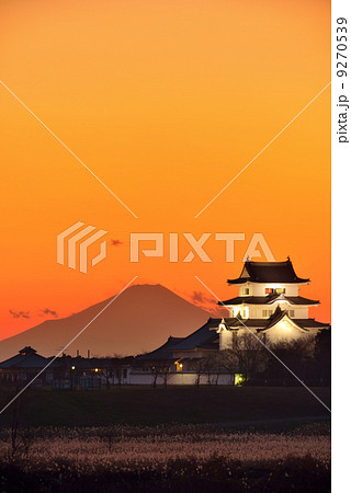 関東の冨士見八景から臨む関宿城の夕日と富士山