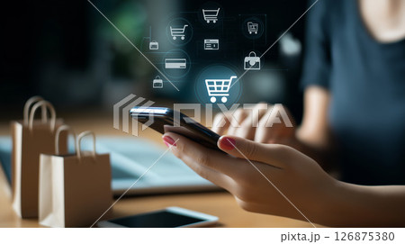 女性, スマートフォン, ネットショッピング, キャッシュレス, クレジットカード, 買い物袋, シ