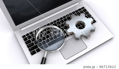 PCの検査・設定イメージ、ノートパソコンと設定アイコンと虫メガネ