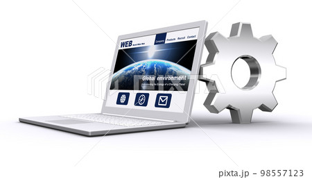 歯車アイコンとノートパソコン、パソコン環境の設定イメージ