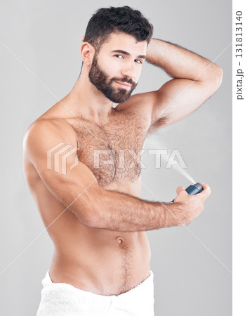 Portrait, deodorant and man spray armpit for hygiene, fresh scent and grooming isolated on a gray studio background. Cosmetics, wellness and young male model with perfume, fragrance or antiperspirant