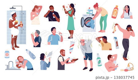 People who observe hygiene. Bad and good smell characters, elimination of unpleasant odor, stink causes, shower or bathing, deodorant, daily personal care tidy vector cartoon isolated set