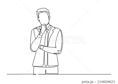 Continuous one line drawing front view of young startup founder standing and thinking about business strategy for office meeting. Business ideas concept. Single line design vector graphic illustration